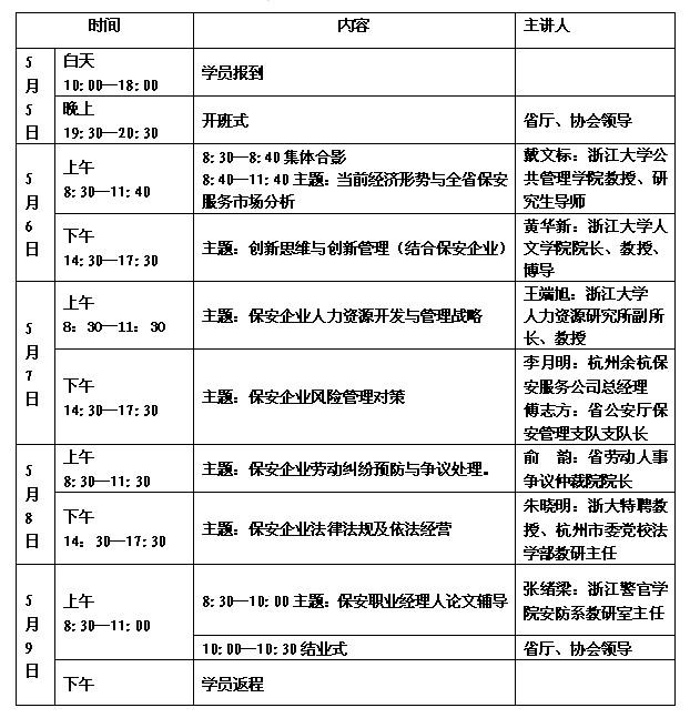 各會(huì )員單位: 根據《浙江省保安協(xié)會(huì )關(guān)于舉辦保安職業(yè)經(jīng)理人培訓班的通知》(浙保協(xié)[2014]6號),結合報名情況,現將第二期培訓班有關(guān)事項通知如下: 一、課程內容及時(shí)間安排