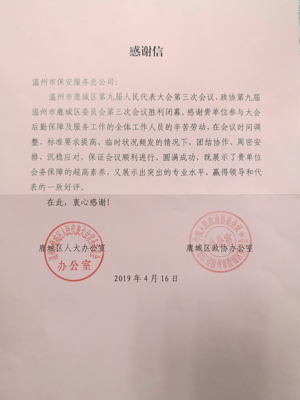 | 【喜訊】溫州市保安服務(wù)總公司收到溫州市鹿城區人大及政協(xié)辦公室的一封感謝信 | |||
